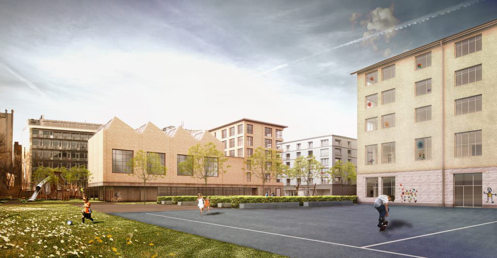 Ein neuer Baustein aus Pestalozzi-Bibliothek, Quartierhaus und Turnhalle ergänzt die bestehende Bebauung an der Heinrichstrasse und entlang des Schützewegs. Die Nutzungen kommunizieren über die Erdgeschosse mit dem Strassenraum und den Freiräumen, zeigen ihre Nutzung nach aussen und laden die Menschen ein. Die Massstäblichkeit orientiert sich an der ehemaligen industriellen Nutzung, welche auch die neuen Gebäude in der Umgebung aufgenommen haben. Die hohe Nutzungsdichte und -intensität sowie die attraktiven Freiflächen machen das Schütze-Areal zu einem urbanen Ort und zentralen Baustein des Quartiers. Die strassenbegleitende Bebauung reagiert dazu auf die urbane Lage, die Architektur auf die industrielle Geschichte des Ortes und die Umgebung.