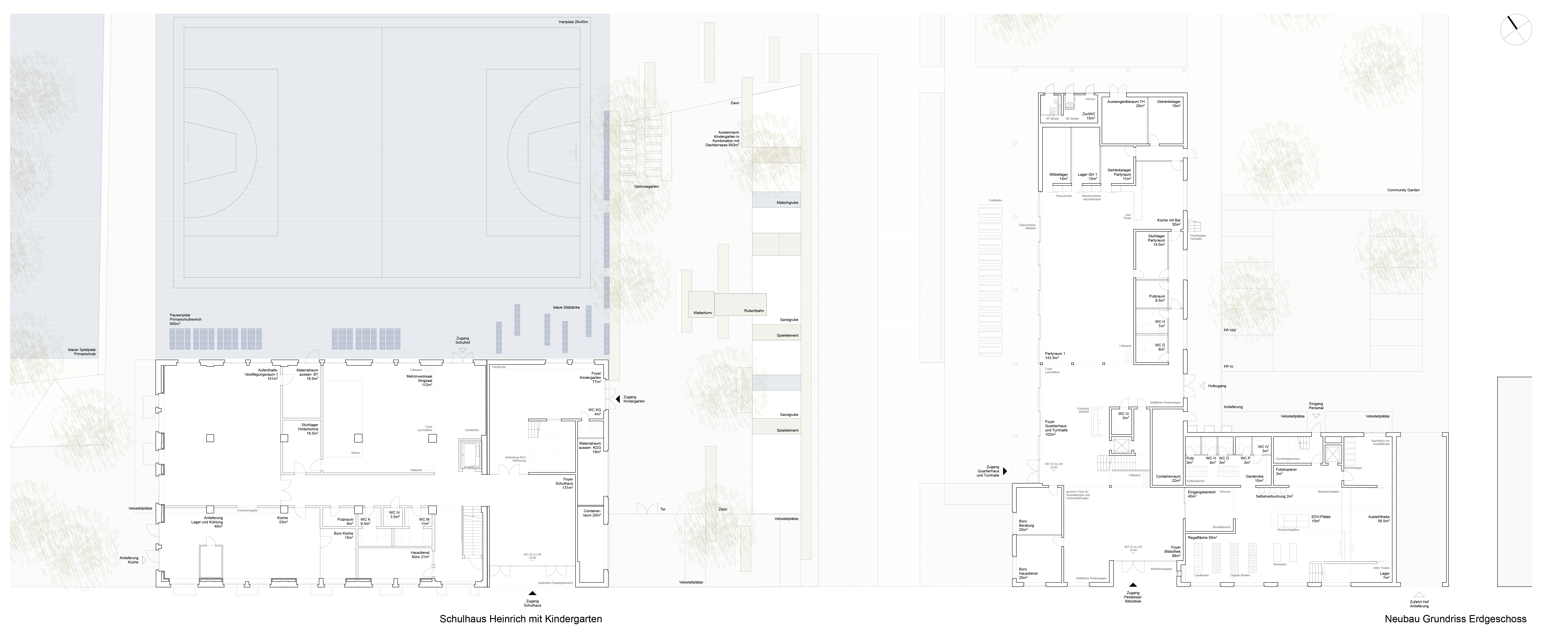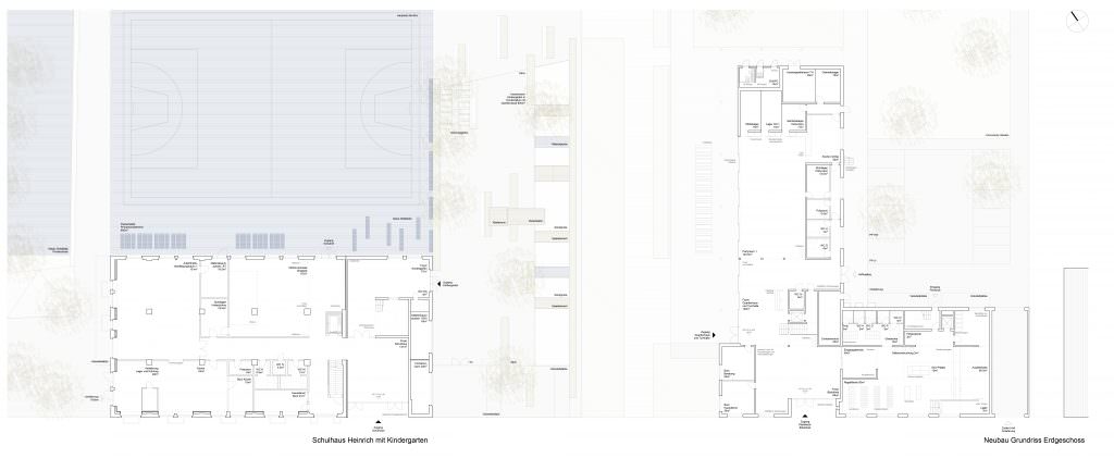 Im Erdgeschoss des Anbaus entstehen grosszügige Foyerbereiche für Schule und Kindergarten mit separaten Zugängen und interner Verbindung. Vier nahezu identische Obergeschosse sind effizient Übereinandergestapelt und nehmen die vier Kindergartengruppen auf. Gruppen- und Klassenraum sind jeweils zweiseitig belichtet und über einen Materialbereich mit Arbeitszone zusammengehängt. Die grossen Öffnungen schaffen starke Bezüge in den städtischen Strassenraum, zum benachbarten Neubau und in den Park mit Freiflächen für Schule, Kindergarten und Hort. Garderobe und Nasszellen vervollständigen den Grundriss der U-förmig um das befensterte Treppenhaus gelegt ist. Im Dachgeschoss wird ein zusätzlicher, zum Teil gedeckter Aussenbereich für den Unterrichts- und Pausenbetrieb mit Spielgeräten und Sitzgelegenheiten angeboten. Betreuung und Kindergarten sind auf zwei Geschossen direkt miteinander verbunden. Schüler- und Lehrerbereiche des Heinrichschulhauses können je nach Betriebskonzept ebenfalls an den Neubau angeschlossen werden.