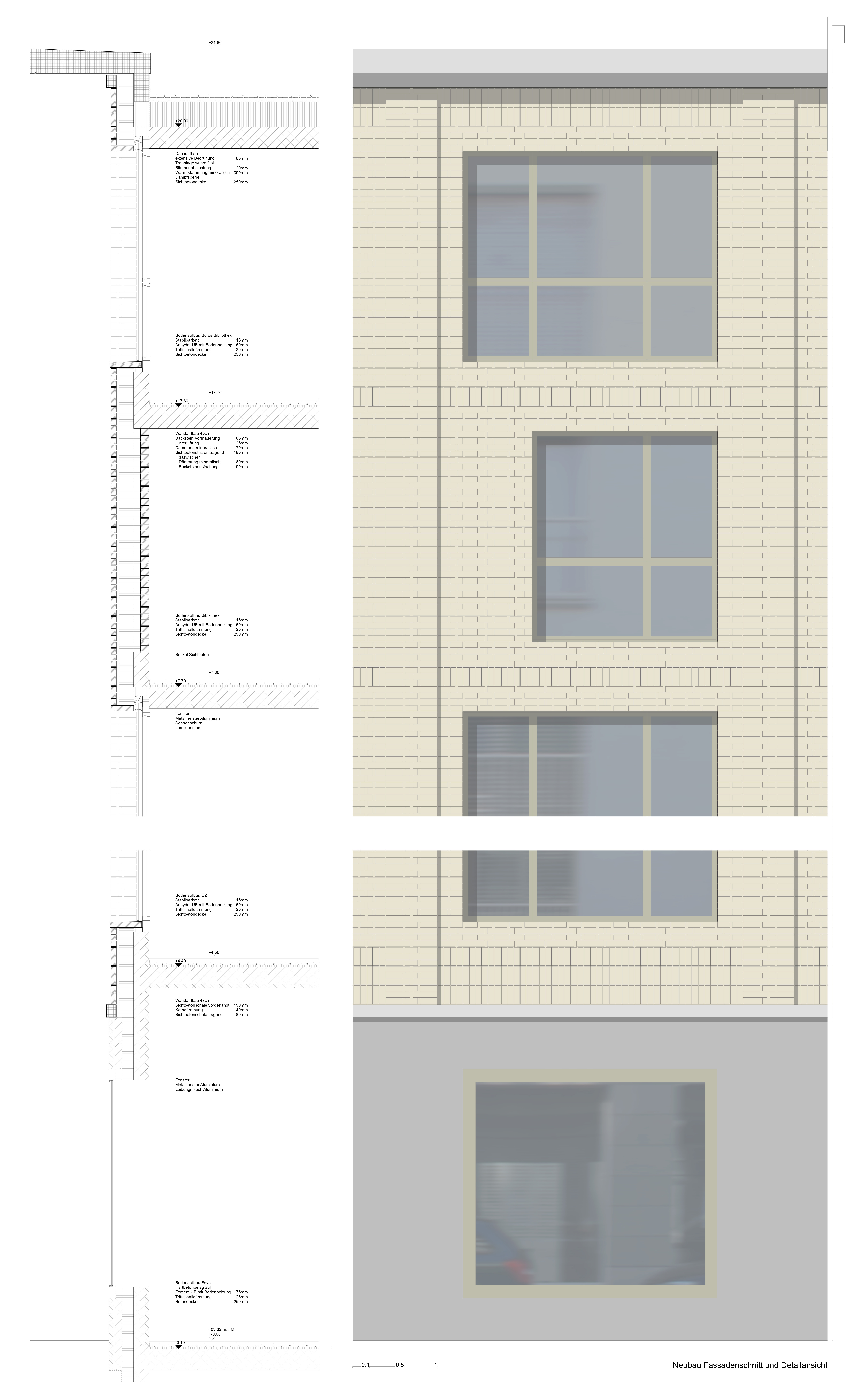 Beim Neubau werden für Industriegebäude typische Materialien verwendet und so ein Bezug zur Geschichte des Areals hergestellt. Auch die Art der Materialanwendung, das bewusste Zeigen der rohen Konstruktion ohne „kosmetische Verschönerungen”, zeugt vom industriellen Charakter der Bebauung. Trotz der offensichtlichen Analogie zu historischen Vorbildern stellt das Projekt durch die präzise Ausformulierung der Details einen zeitgemässen Beitrag zur modernen Architektur dar. Die äussere Erscheinung ist geprägt durch ein fein profiliertes Backsteingebäude welches auf einem Sichtbetonsockel ruht. Die Profilierung zeigt auf ehrliche Weise das statische System des Gebäudes, skelettartig werden die Lasten in die Fundamente abgeleitet. Auch im Inneren wird dieses System spürbar. Die Aussenwände bestehen aus einem tragenden Sichtbetonskelett, welches mit sichtbarem Backsteinmauerwerk ausgefacht wird. Die Geschossdecken bleiben ebenfalls roh in Sichtbeton, technische Installationen werden sichtbar unter der Decke geführt oder in diese integriert. Komplettiert werden die Räume durch hölzerne Einbauten und Bodenbeläge bzw. gegossene Hartbetonböden in den Erschliessungsräumen.