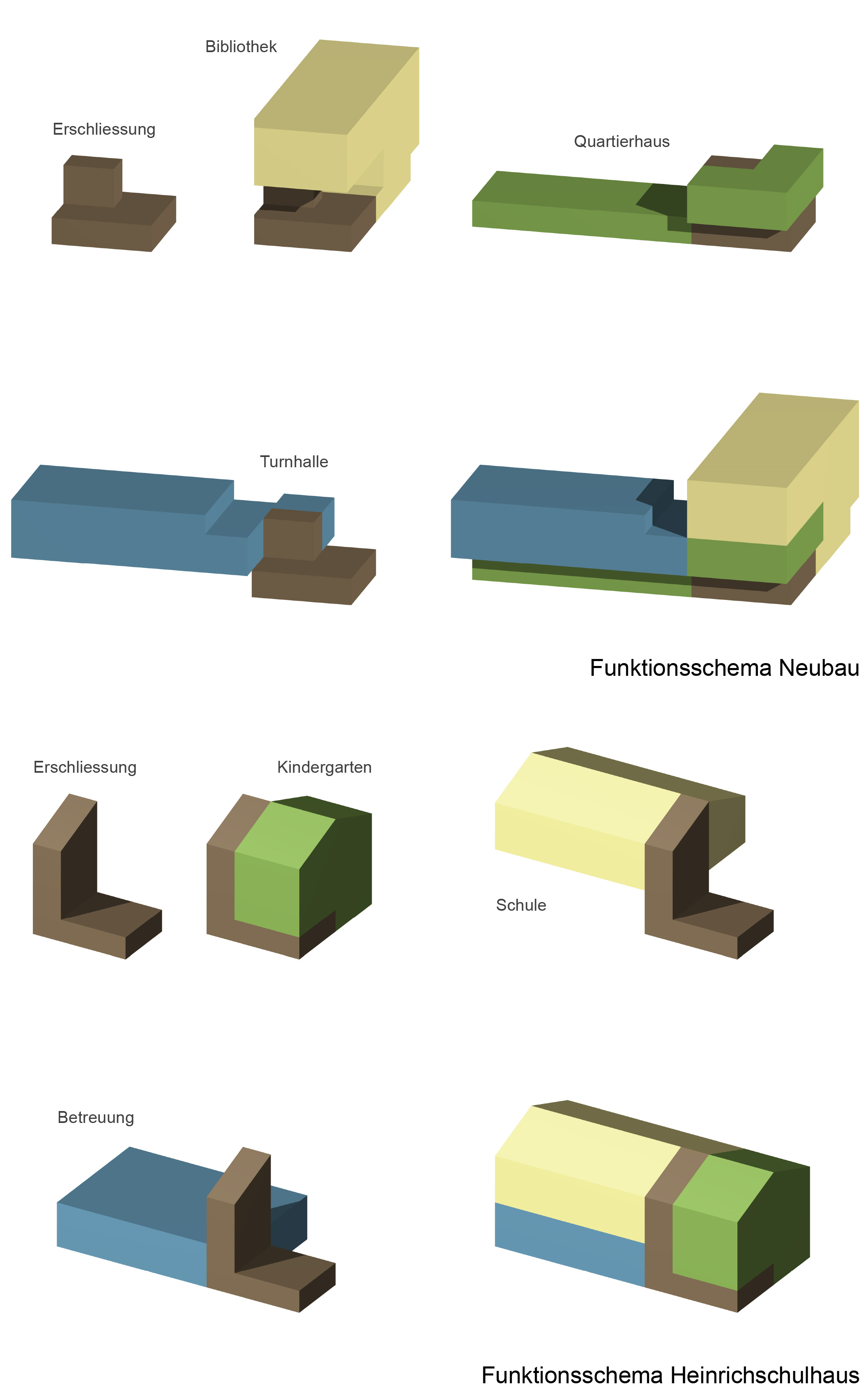 Der Neubau Schütze vereint in einem Bauvolumen drei autark funktionierende Nutzungseinheiten. Während sich Turnhalle und Bibliothek jeweils nur in den Park respektive den Stadtraum orientieren zeigt sich das Quartierhaus mit seinen Bewegungsräumen im Strassenbild und öffnet sich gleichzeitig entlang des Schützewegs zum Park. Konsequent erschliesst sich die Bibliothek von der Heinrichstrasse, Turnhalle und Quartierhaus vom Schütze Weg. Beiden Eingängen sind offene Foyerbereiche angegliedert, welche sich für Grossanlässe oder Ausstellungen zusammenschalten lassen.