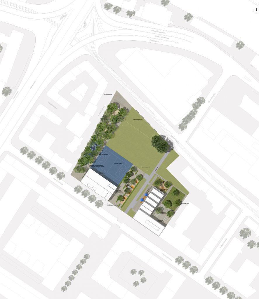 Die Umgebung des Schütze-Areals im Kreis 5 zeichnet sich durch bauliche Dichte, Nutzungsmischung und strassenbegleitende Gebäude aus, die klassische urbane Strassenräume bilden. Die neue Bebauung orientiert sich daran, ergänzt das Vorhandene und entwickelt es weiter. Dicht, kompakt und urban ist die Prämisse für die Transformation des Schütze-Areals. Ein haushälterischer Umgang mit Land spielt dabei eine ebenso wichtige Rolle wie eine städtebauliche Setzung in einer heterogenen urbanen Umgebung.