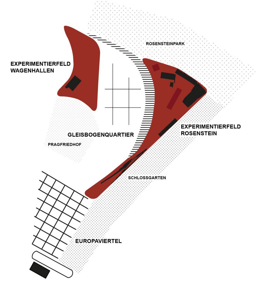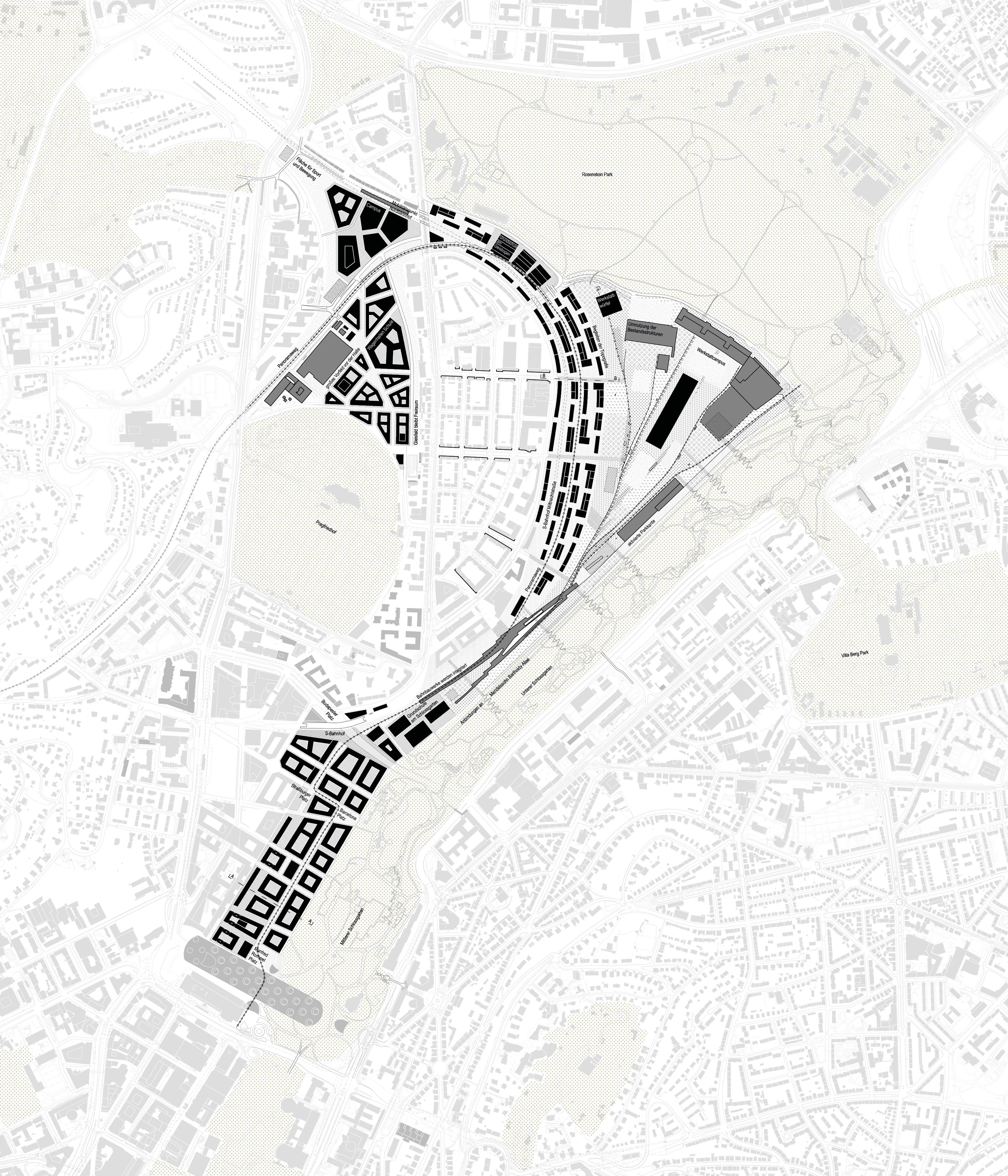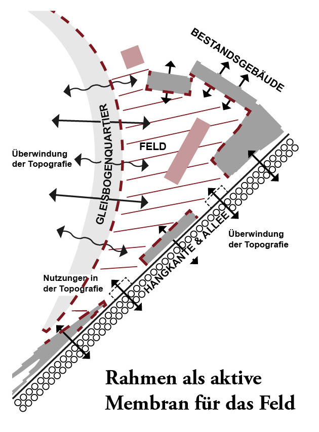 bildet den Abschluss des Experimentierfelds nach Westen und des Eisenbahnerviertels nach Osten, indem es den ehemaligen Gleisbogen nachzeichnet. Diese starke räumliche Setzung bleibt erhalten, seine Topografie wird besiedelt, Freiräume mit dem Panoramaweg im Zentrum alltagstauglich gestaltet. Hohe Punkthäuser in Verwandtschaft zu den Conradi-Hochhäusern und auf aktiven Sockelzonen liegende Zeilen schaffen eine neue Silhouette. Das Gleisbogenquartier ist aktive Membran und Verbinder zugleich.