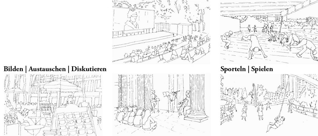Zentrales Element des Entwurfs ist dieser neue, große und großzügige Freiraum: ein aktiver, produktiver, inklusiver Raum, in dem das Machen im Vordergrund steht. Hier wird gedacht, ausprobiert, getestet, gelernt, ausgetauscht und diskutiert. Alle Nutzungen werden als Werkstätten gedacht und gebaut: Schulen, Museum, Konzertsaal, Gärten, Sportstätten sind Wissens-, Produktions-, Bewegungs- und Kunstwerkstätten in einem. Der Rosenstein ist eine Einladung an alle Stuttgarter*innen, ein Angebot. Architektur als Dis-ziplin muss hier neu gedacht sein. Das Experimentierfeld versteht sich als Ergänzung zu den bestehenden Parks und zentralen Orten in Stuttgart, ist in das städtische Netzwerk über vielfältige Verbindungen und Bezüge eingebettet, wird zum inklusiven Ort für die Stadtgesellschaft. Dieses mit Raumatmosphären arbeitende Konzept setzt in der räumlichen Umsetzung den Erhalt der weiten, offenen Fläche voraus und integriert somit auch die wichtigen stadtklimatologischen Aspekten.