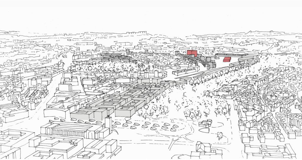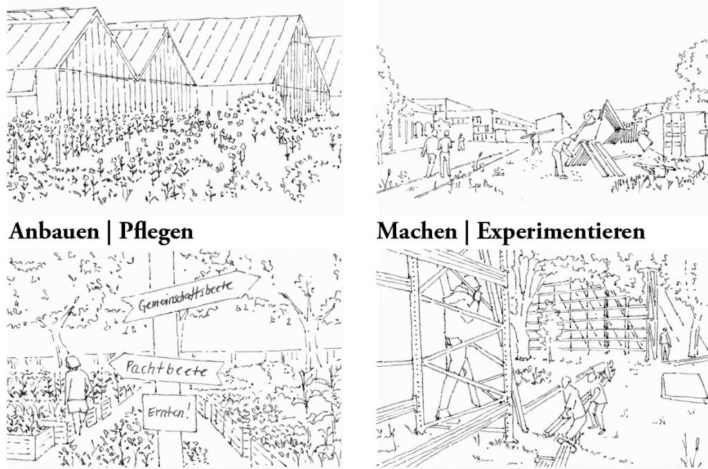 legt den Fokus auf das Verbinden von Wohnen und Arbeiten, in dem das künstlerische Schaffen eine Form davon ist. Der Panoramaweg verbindet und teilt gleichzeitig das Experimentierfeld. Eine dichte, niedrige Grundstruktur aus Baufeldern, die sich aus dem Bestandsbezügen entwickeln, bildet die räumliche Grundstruktur. Hier können neue Modelle und Typologien einer nachhaltigen und inklusiven Stadt erprobt werden. Das Repertoire der Stadträume arbeitet mit sekundären architektonischen Elementen wie Rampen, Dächern, Treppen und Aneignungszonen um die Häuser. Gelebt und gearbeitet wird hier innen wie außen. Der Straßenraum ist wieder Raum für alle.