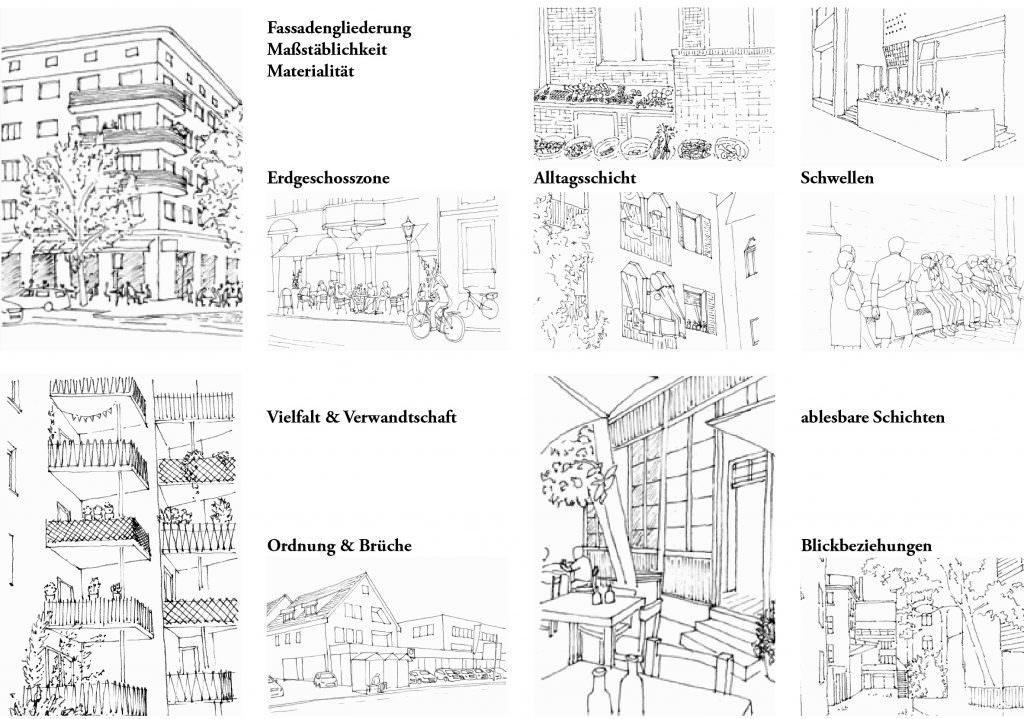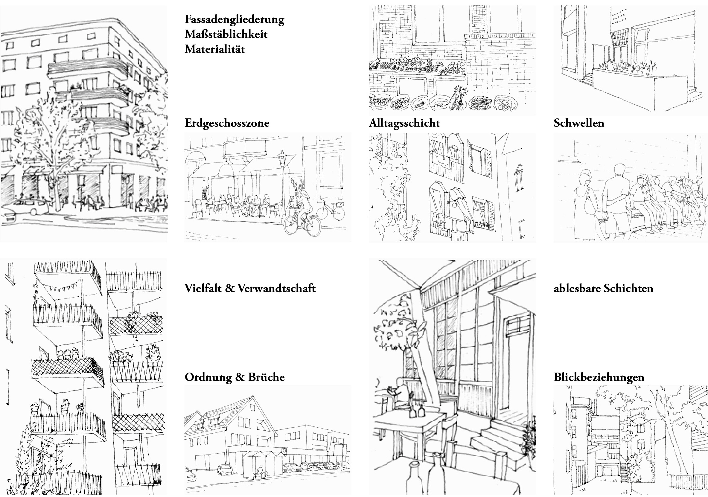 Die Gestaltung von Eingängen und Vorzonen, bewusst artikulierte Schwellen und Grenzen, ablesbare Schichten und Zonierung, Blickbeziehungen in den Block hinein sind die Basis für eine Alltagsschicht, für Situationen und das Schaffen von Gelegenheiten. Stadtklimatische Aspekte wie die Ausgestaltung der Innenhöfe als begrünte aktive Zonen nach dem Schwammstadtprinzip bilden einen wichtigen Teil des Repertoires.