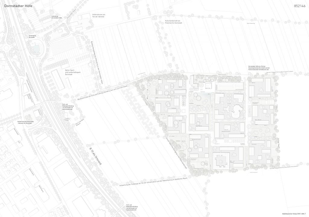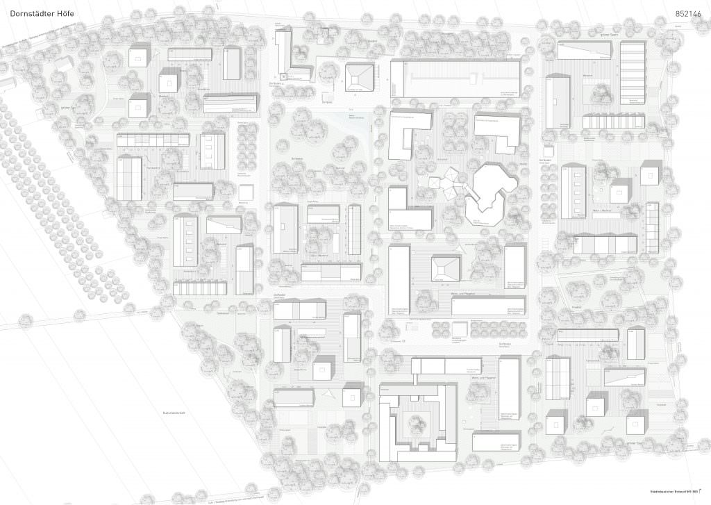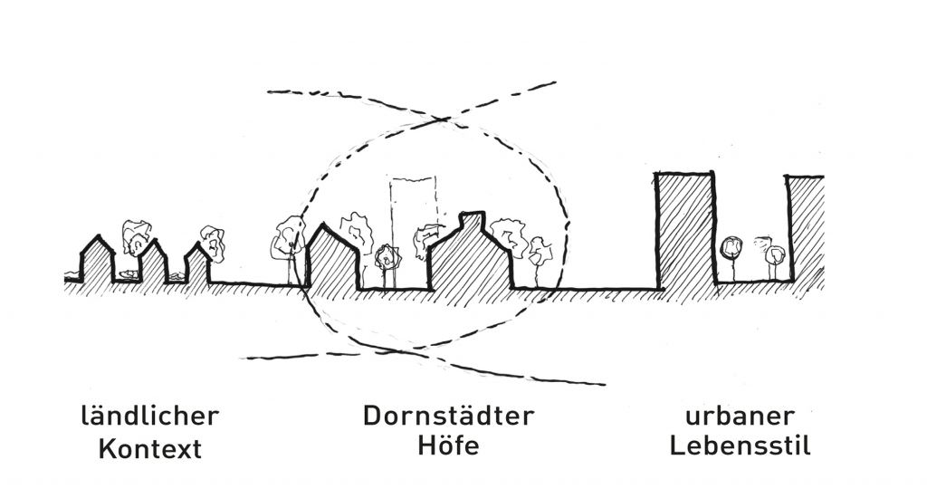 Diese Grundfrage nahmen wir zum Anlass Ort und Programm auf ihre Synergien hin zu betrachten. Ähnlich einem Ökoton entsteht für uns aus dieser Kombination des Ruralen und Urbanen ein ganz eigener Lebensraum mit besonderen Typologien in der Architektur und in den Freiräumen, die ihre Basis im Ortstypischen haben. Ein ländlich urbanes Quartier befriedigt den Wunsch nach Individualität und Rückzugsorten ebenso wie jenen nach Gemeinschaft und Austausch. Nicht das generische Einfamilienhausgebiet sondern ein Quartier mit Ortsidentität und Qualität zu entwickeln war unser Ziel. Ein Quartier, das einen Namen trägt, identifizierbar ist und eine dem Ort entsprechende bauliche wie atmosphärische Dichte entwickelt: Die Dornstädter Höfe
