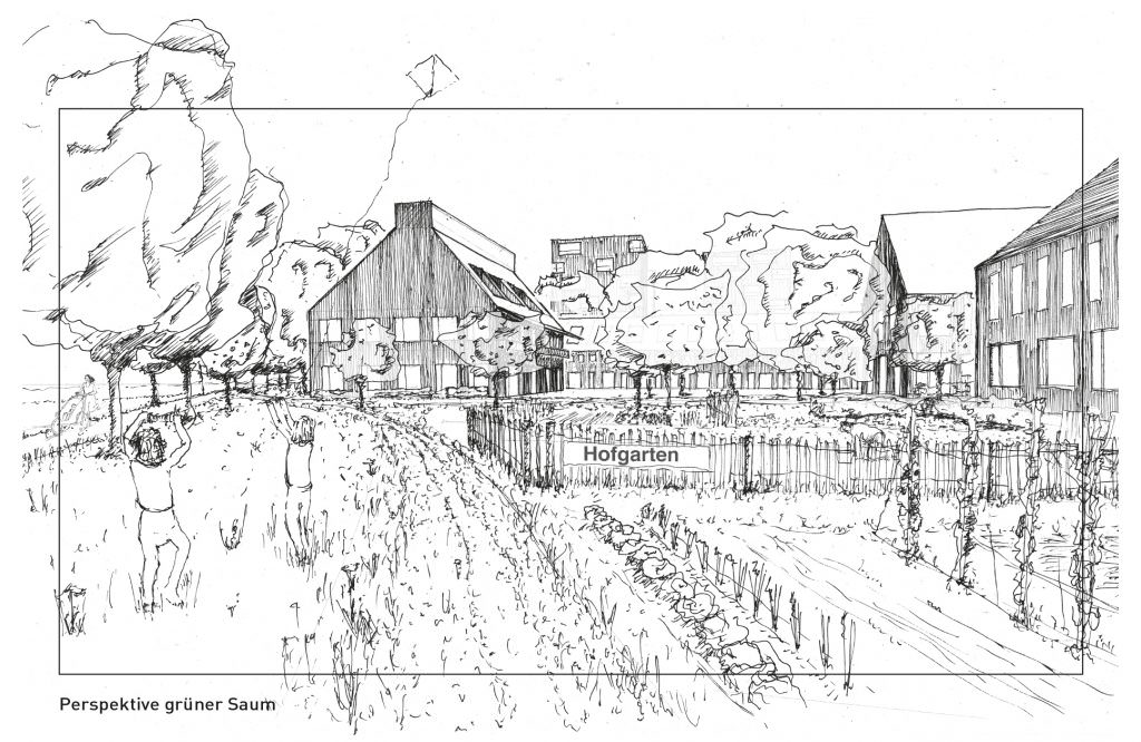Der grüne Saum umfasst und definiert das Quartier nach Außen, flankiert von Feldwegen um das Quartier. Auch hier wird der Baumbestand weitgehend erhalten und ergänzt. Im grünen Saum befinden sich die privaten Gärten der Hofstellen. Diese ergänzen als Freiflächen die Hofinnenbereiche, Loggien und Dachterrassen. Sie bieten die Möglichkeit für interessierte Bewohner Obst, Blumen und Gemüse anzubauen. Die Gärten können eingefriedet sein und sind eingebettet in Wiesenflächen, die durch Trampelpfade durchzogen sind. Innerhalb der Wiesenflächen finden naturnahe Spielgeräte für Kinder ihren Platz. Der grüne Saum weitet sich zwischen den Hofstellen bis zum Dorfboden und verbindet mittels der Feldwege in die Landschaft.