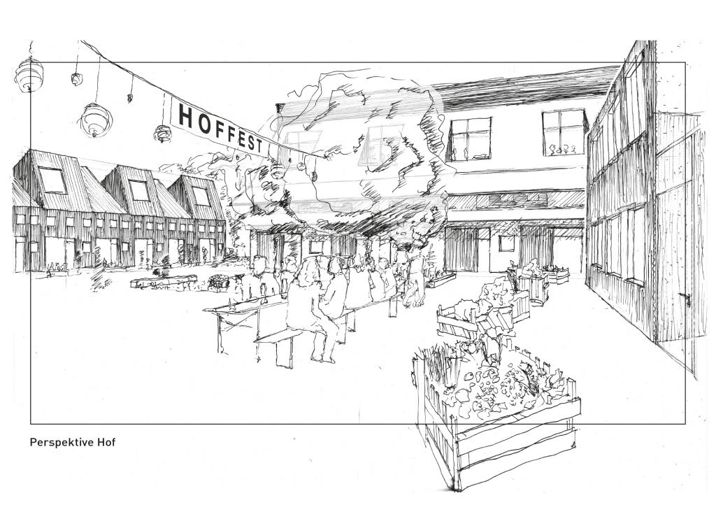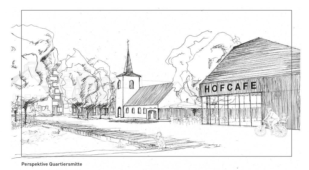Auf einer Hofstelle bilden die Gebäude einen Innenhof für die Hofgemeinschaft aus und artikulieren den Hof nach außen. Der Eingang in den Hof wird durch einen Rücksprung besonders betont. Bestehende Bäume werden behutsam integriert und raumwirkend inszeniert. Die Gebäude bilden eine Nachbarschaft aus, die sich den gemeinschaftlichen Innenhof teilt und entsprechend ihrer Bedürfnisse gestaltet. Innerhalb der Hofstellen ist eine große Varianz an architektonischen Typologien und Wohnformen möglich. Die gezeigte Bebauung ist hierfür ein Vorschlag. Wichtig sind die Schwellenbereiche zwischen den gemeinschaftlichen und privaten Flächen. Die Neuinterpretation der ortstypischen Bautypen Hofhaus, Scheune, Stall und Silo erlaubt vielfältigste Wohnformen von Geschosswohnungen in unterschiedlichsten Größen, Maisonetten und erdgebundenem Wohnen. Sondernutzungen wie ein Schulhof, Pflegehof und Werkhof ergänzen die im Wesentlichen der Wohnnutzung vorbehaltenen Wohnhöfe. Die Vergabe und Entwicklung der Höfe kann durch Konzeptvergabe bevorzugt an Baugruppen oder kleine Genossenschaften erfolgen um dadurch die Möglichkeit zu geben, das Quartier aktiv mitzugestalten.