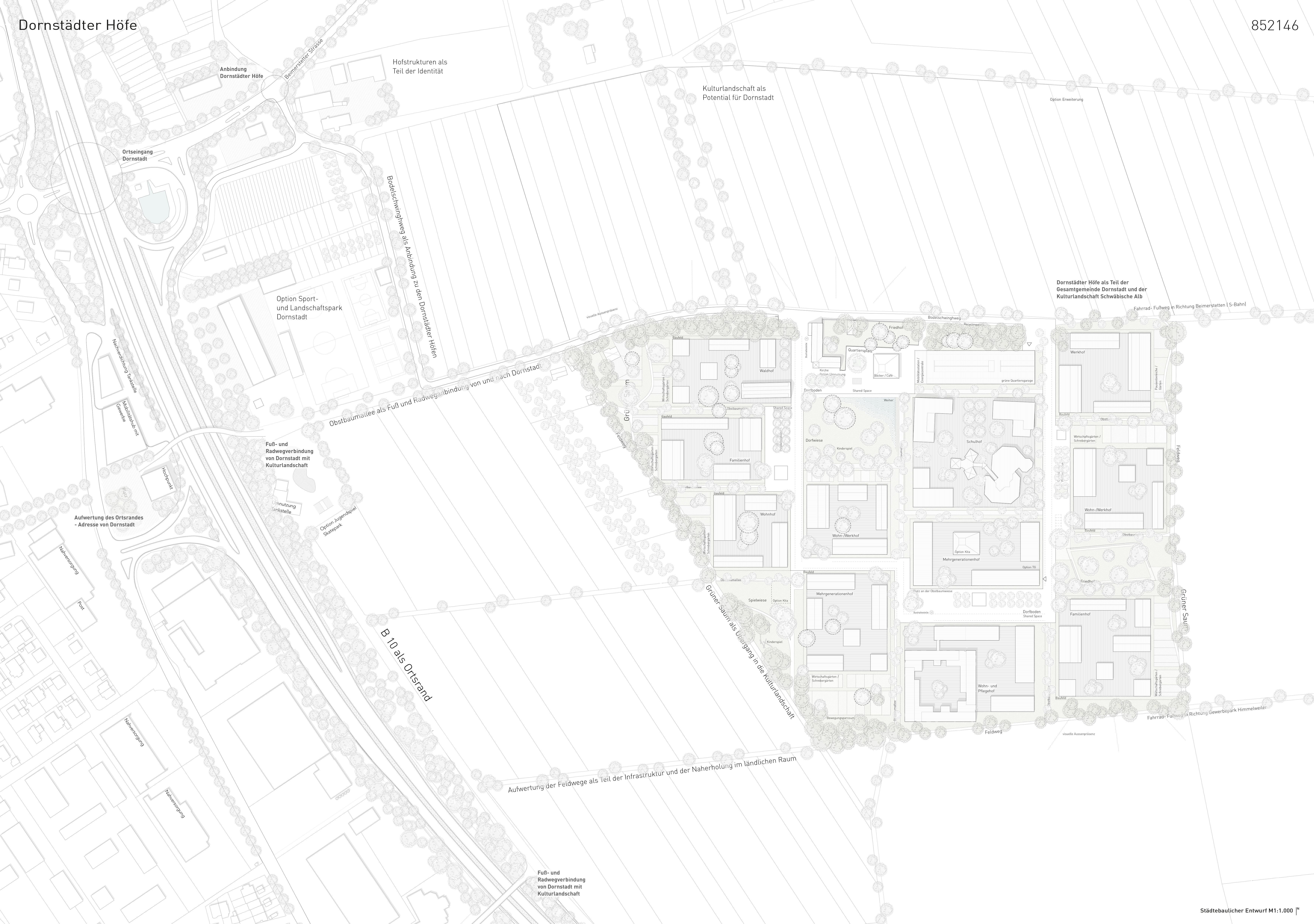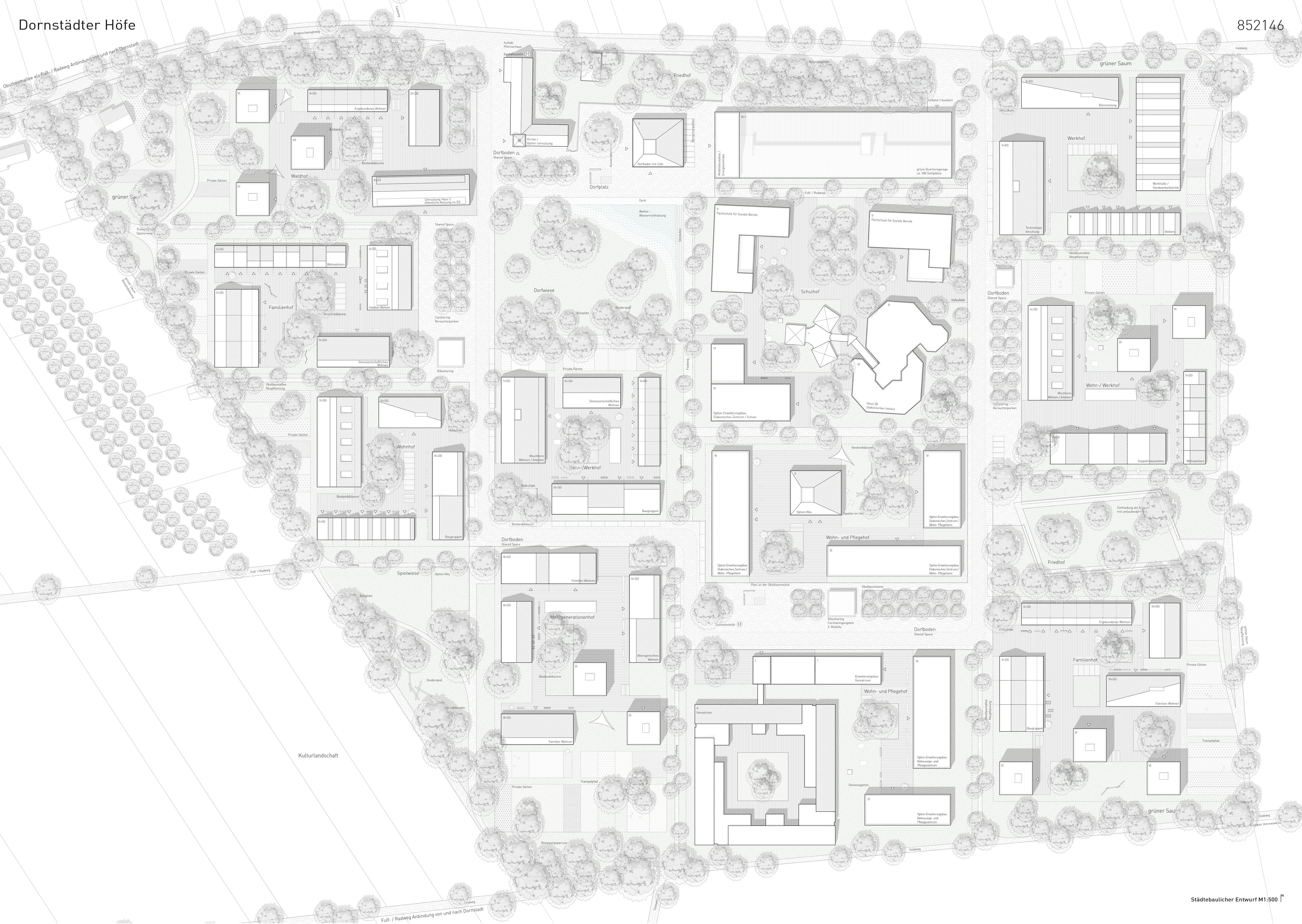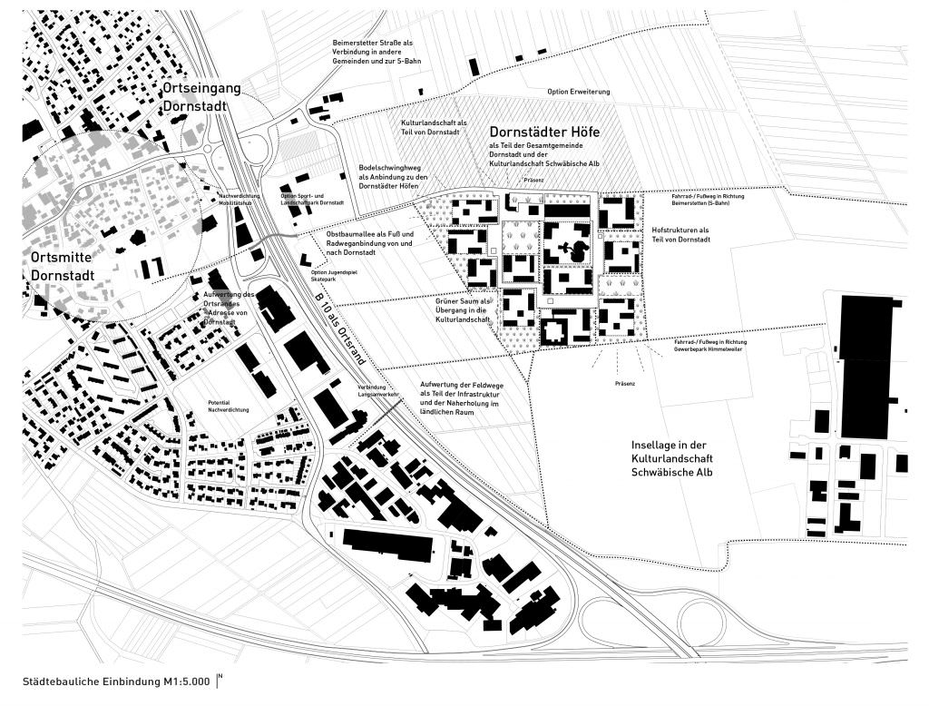 Die städtebauliche Grundordnung aus Hofstellen, Dorfboden und Saum bildet eine robuste und qualitätsvolle Struktur für das Quartier. Diese drei Elemente bieten die gewünschte Bandbreite von öffentlichen, gemeinschaftlichen und privaten Räumen in den Freiräumen wie der Architektur. Das Quartier ist in Phasen entwickelbar und bietet Spielraum durch die Ordnung in Höfen. Eine programmatische und typologische Bandbreite sowie unterschiedliche Miet- und Eigentumsmodelle sind möglich.